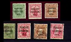 Another example, from New Zealand, is four stamps overprinted for an industrial exhibition held in Auckland in 1913. The accompanying image shows genuine overprints, and forged overprints from an internet auction. A New Zealand dealer prices a set of postally used stamps with genuine overprints at NZD 1600, while the same four stamps, postally used without the overprint, are priced at NZD 8.[25] This indicates the potentially lucrative payoff for forgers.