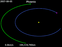 Animation of Phoenix's trajectory from August 5, 2007, to May 25, 2008 Phoenix·Sun·Earth·Mars