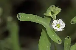The inflorescence consists of cymes of 2 to 10 flowers each under a centimeter wide. Each pedicel is 5–20 millimetres (0.2–0.8 in). Calyx lobes are oblong and 1–3 millimetres (0.04–0.12 in). The flower is white, usually with a purple spot or streak on each of its five lobes.[2]