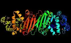 ![]() 3D cartoon depiction of a phosphoribulokinase protomer from Methanospirillum hungatei | |||||||||