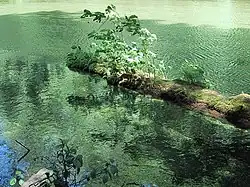 Terrestrial and aquatic phototrophs: plants grow on a fallen log floating in algae-rich water