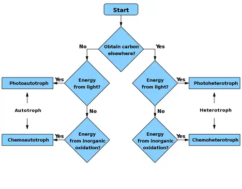 Flowchart to determine if a species is autotroph, heterotroph, or a subtype