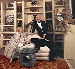 Becoming more entrenched in the social world of Los Angeles and Hollywood as her fame grew, Morris befriended many in the show business community and counted Joan Crawford, Lucille Ball, Gypsy Rose Lee, Liberace, Joan Collins, Regis Philbin and author Harold Robbins, to name a few, as part of her inner circle. And so impressive were Morris' parties at both her Beverly Hills home and her Los Angeles showroom that Town & Country magazine wrote "Certainly this was THE top party of the holiday season," [3] referring to a 1966 soiree at Morris' 17-room manse. Many Hollywood film fans would have relished being at the Morris showroom in 1970 when Joan Crawford stopped in to look for artwork for her home. Morris offered the screen legend a Coca-Cola. The following day, 20 cases of Pepsi-Cola arrived at the Phyllis Morris showroom with a note from Crawford saying "Pour all those Cokes down the drain."