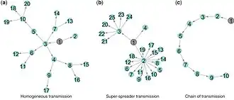 Whole-genome sequence data from outbreaks or epidemics of infectious diseases can provide important insights into transmission dynamics and inform public health strategies. Traditionally, studies have combined genomic and epidemiological data to reconstruct transmission events. However, recent research has explored deducing transmission patterns solely from genomic data using phylodynamics, which involves analyzing the properties of pathogen phylogenies. Phylodynamics uses theoretical models to compare predicted branch lengths with actual branch lengths in phylogenies to infer transmission patterns. Additionally, coalescent theory, which describes probability distributions on trees based on population size, has been adapted for epidemiological purposes. Another source of information within phylogenies that has been explored is "tree shape." These approaches, while computationally intensive, have the potential to provide valuable insights into pathogen transmission dynamics.[87]