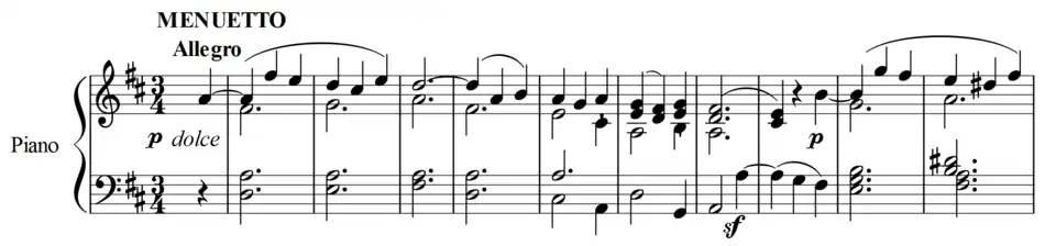 The third movement is in compound ternary form (minuet and trio). The minuet is in D major, the main key of the sonata and the trio is in the subdominant key of G major.[2]