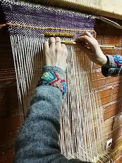 A larger-scale looped-pile weft on a vertical loom, using a knitting needle, for clarity.