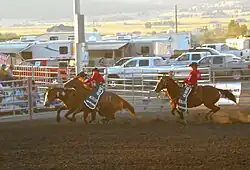 A pickup rider is a person on horseback who works at a rodeo in the rough stock competitions of bareback riding, saddle bronc riding, and bull riding.[1] Pickup riders play an important role in assisting rodeo riders and increasing the safety of competitors.