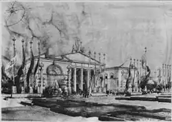 During the First World War, Portaluppi worked for the military in the Veneto and Friuli Regions. He resumed his professional activity after the war, rebuilding la Pinacoteca di Brera, the Villa Fossati, and the Casa degli Atellani in Corso Magenta, the home of Ettore Conti. Conti introduced Portaluppi to Milan's high society and he started to have the city's most important families as clients such as Borletti, Fossati, Venti and Crespi, Angelo Campiglio, and Mino Brughera. In 1920, Portaluppi designed two projects that are viewed as emblematic of his architecture: the skyscraper S.K.N.E. for the area of Allabanuel, and an utopian city, Hellytown.[4]