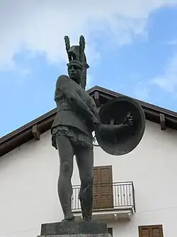A statue depicting the ancient Samnite soldier as he had represents the sacrifice of the fallen Pietrabbondantesi in World War I. An immigrant committee formed by Alessandro DiTullio in America raised money in July 1919 to remember the war victims. Subsequently, in February 1920, the Pietrabbondante City Council proceeded to erect the war memorial with these funds.