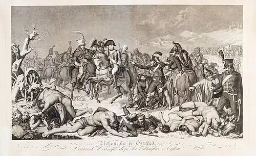 To perfect his technique, he went to Milan, where he studied with Giuseppe Longhi. He spent nine years there, mostly as an assistant to Longhi, but continued to produce his own engravings. A notable exception came when he was entrusted with a commission from Eugène de Beauharnais, the Viceroy of the Kingdom of Italy. It was to be a depiction of Napoleon, visiting camp after the Battle of Eylau. The engraving was based on a painting by Antonio Raffaele Calliano, and won a gold medal for Anderloni in 1810.[2]