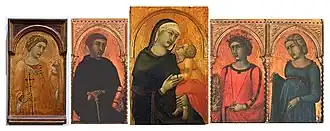 The gilded three-story altarpiece, the Arezzo (or Aretine or Tarlati) Polyptych, was commissioned in 1320 by Bishop Guido Tarlati for the Santa Maria della Pieve in Arezzo.[25] At its centre is the Madonna (draped in a magnificent ermine-lined robe) and Child, flanked by the saints John the Evangelist, John the Baptist, Matthew, and Donatus (Arezzo's patron saint, martyred in 361 CE). The rich colours, graceful lines, decorative detail, and supple figures (suggestive of Martini's influence), endow the piece with "a vivacity rare in contemporary Sienese art".[1]
