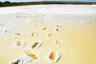 The brine consists of a high proportion of sodium chloride and sulfate, as well as appreciable amounts of carbonates and bicarbonates which in addition to hypersaline, make the lake alkaline.[6] The pH of the waters has a value around 9.3 (slightly higher than neutral pH 7 or seawater mean pH 8).[2]