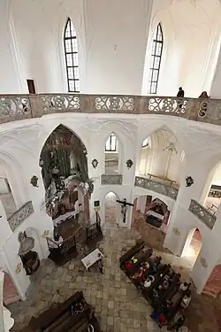 The church, with many furnishings designed by Santini himself, is remarkable for its gothicizing features and complex symbolism, quite unusual for the time. In 1994, it was declared a World Heritage Site.[1] The nomination dossier pointed out Santini's mathematical ratios in its architecture which aimed at "the creation of an independent spatial reality", with "the number 5 being dominant in the layout and proportions" of the church.[1][2]