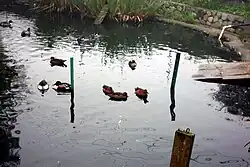 In the 1880s, a member of the Denny family built a house on North 90th Street and Densmore Avenue North in Seattle. James and Marietta Pilling purchased the property in 1909, and converted it to a dairy farm.[1] In 1924, their twelve-year-old son Charles A. Pilling (October 6, 1911 – October 24, 2001) dug a small pond to care for three injured mallard ducks he had been given.[2] This began Pilling's lifelong interest in breeding waterfowl. Over the years, the size of the pond was expanded to 100 by 50 feet (30 m × 15 m) on the half-acre lot. It was fed fresh water by diverting Licton Springs. It is bordered by bamboo stands, and yet with a viewing area on North 90th Street, it still remains part of Seattle's urban landscape. In the 1950s Pilling created a manually operated flood control system that was still in use in 2011.[3]