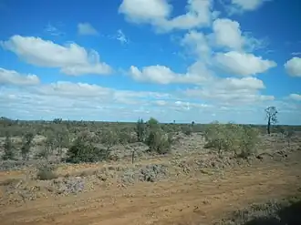 The Central Western railway line reached Pine Hill in 1883, with the Pinehill railway station at 23°39′01″S 146°57′23″E / 23.6503°S 146.9565°E its terminus.[7] The station buildings were completed in July 1883.[8] According to the Queensland Railways Department, the railway station was so named because the surrounding ridges were once covered in cypress pine.[9]