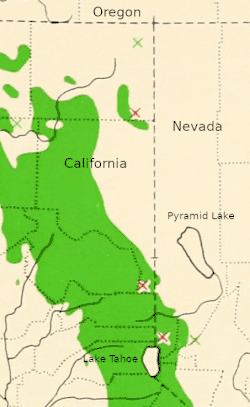 | Pinus washoensis range marked with red X, P. jeffreyi in green | |
