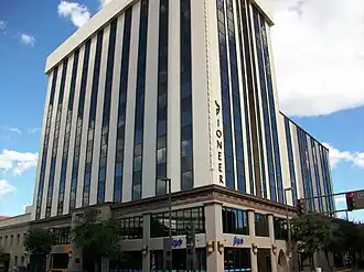The Pioneer Hotel, designed by Tucson architect Roy Place, was one of Tucson's first high-rise buildings. Opened in 1929, the Spanish Revival hotel became the social center of the downtown business district. The property catered to the social elite.[2] In the mid-20th century Harold and Margaret Steinfeld, owners of a large downtown department store, lived in the penthouse. A disastrous fire severely damaged the building in December 1970, and among the 29 victims were the Steinfelds. The building has been converted from a hotel to an office building.