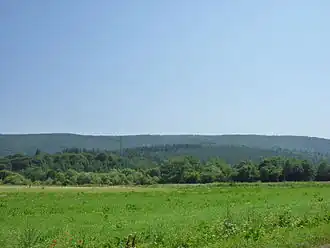 The tallest mountain in the Beskid Dukielski,[3] Piotruś is relatively flat-structured, giving it its alternative name of Płazyna.[4] The mountain is crescent-shaped, aligned roughly north-south. It is bounded to the west and south by the valley of the Jasiołka river, separating it from Ostra Mountain to the south.[2] The mountain is covered in forest, primarily old beech trees, and near the top, in birch, European mountain-ash and alder.[3] A spruce forest on Piotruś's western slope was mostly destroyed in a fire during the interwar period. A yellow sandstone rock is prominently displayed at the top of the mountain, which likely contributed to its name (Piotr – Polish for Peter – also means stone). Some of it was excavated for buildings, and several unused large blocks can be found.[4]
