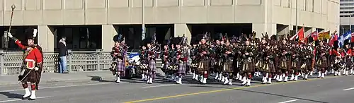 A pipe band is a musical ensemble consisting of pipers and drummers.[1] The term pipes and drums, used by military pipe bands is also common.