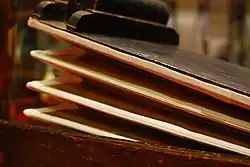 A pipe organ has one or more keyboards (called manuals) played by the hands, and most have a pedalboard played by the feet; each keyboard controls its own division (group of stops). The keyboard(s), pedalboard, and stops are housed in the organ's console. The organ's continuous supply of wind allows it to sustain notes for as long as the corresponding keys are pressed, unlike the piano and harpsichord whose sound begins to dissipate immediately after a key is depressed. The smallest portable pipe organs may have only one or two dozen pipes and one manual; the largest pipe organs can have over 33,000 pipes and seven manuals.[1] A list of some of the most notable and largest pipe organs in the world can be viewed at List of pipe organs. A ranking of the largest organs in the world—based on the criterion constructed by Michał Szostak, i.e. 'the number of ranks and additional equipment managed from a single console'—can be found in the quarterly magazine The Organ[2] and in the online journal Vox Humana.[3]