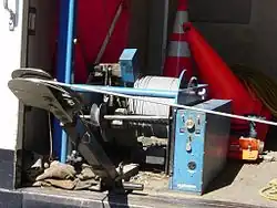 At the back end of the truck is a powered reel with video cable reinforced with kevlar or steel wire braid. Some trucks also contain a powered winch that booms out from the truck allowing for lowering and retrieval of the inspection equipment from the pipeline.