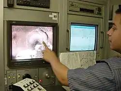 Sometimes referred to as a PIG (pipeline inspection gauge), the camera and lights are mounted in a swivelling head attached to a cylindrical body. The camera head can pan and tilt remotely. Integrated into the camera head are lighting devices, typically LEDs, for illuminating the pipeline. The camera is connected to display equipment via a long cable wound upon a winch. Some companies, such as Rausch Electronics USA, incorporate a series of lasers in the camera to accurately measure the pipe diameter and other data.
