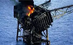 ![]() Piper Alpha on fire shortly after the failure of the Tartan gas riser | |