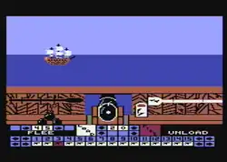 While sailing from one port to another, the player's ship may be attacked by pirates, leading to a real-time action sequence. The enemy ship slowly passes in front of the player's 15 cannons, shown one at a time from behind. In order to fire, it is first necessary to select the elements in the correct sequence with the pointer and perform the following loading operations: inserting and pressing powder, inserting ball and brushing barrel. The player must then choose a cannon and adjust the elevation. If the opponent is defeated, there is a choice between seizing its gold or the captain's log, which contains information.