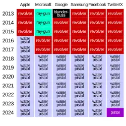 By mid-2019, the pistol emoji was rendered as a revolver in the Facebook Messenger, HTC, Mozilla, and Softbank emoji sets, a pistol in the LG and Docomo emoji sets, and a squirt gun in the Apple, Google, Microsoft, Samsung, WhatsApp, Twitter and Facebook emoji sets;[29] this remained the case through 2020,[30] 2021,[31] 2022,[32] and 2023.[33]