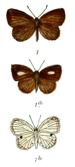 Male upperside: brown, in fresh specimens generally uniform, in some slightly paler along a posterior area from base outwards on the forewing. This is more commune in the female than in the male. Underside: milk white. Forewing: a few very obscure specks along the costa, and a postdiscal transverse series of four transversely elongate spots, or short broad lines, pale brown; the spots of the latter arranged two subcostal and two posterior close to the tornal angle; beyond these is a continuous transverse broad brown line that gets paler posteriorly, from costa to dorsum, followed by a subterminal series of similarly-coloured transverse spots, one in each interspace; at the apex these are generally coalescent with the inner brown line; lastly an anteciliary dark brown line. Cilia dark brown. Hindwing: a curved postdiscal series of transverse pale brown spots that terminate at the costa in a prominent large round black spot; a continuous broad pale brown curved line followed by a subterminal dark brown series of spots and an anteciliary line as on the forewing. Cilia white. Antennae, head, thorax and abdomen brown; the antennae spotted with white on the inner side: beneath: the palpi, thorax and abdomen white.[1]