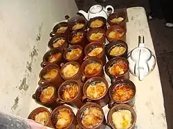 In Armenia, putuk (Armenian word for crock[4]) is traditionally served directly in the clay pot in which it was cooked. The soup is often accompanied by an Armenian leavened bread called matnakash, which can be dipped into the broth. In some regions, the soup is consumed in two steps. Firstly, the broth is served with the bread, and secondly the meat gets added to the broth and the side dish gets served. The main ingredients include lamb meat, mutton, tail fat chickpeas, potatoes, onions, dried alycha and saffron.[5][6]