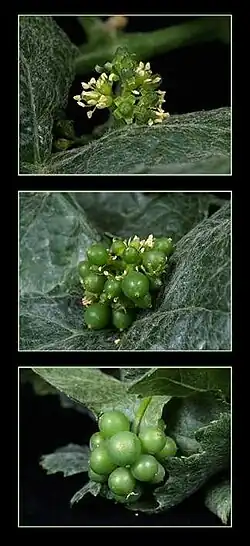The Pixie is a unique grape in that its size is the most important part of its genotype and phenotype. It usually only grows up to about 2 feet in height and does not usually span out in horizontal growth. Internodes on a Pixie are about 25% the length of the Pinot Meunier chimeras length. Flowering is constant on a vine that is still alive and it is not uncommon to view all types of flowering from buds all the way up to ripe fruit just on one vine. Pixies do not grow tendrils however, instead they grow Inflorescences(group or cluster of flowers).
