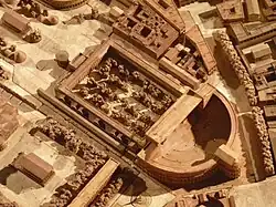 The first modern models of Rome appeared at the end of the 18th century, made of cork or plaster,[38][39] intended for wealthy tourists or collectors like Louis-François-Sébastien Fauvel and Louis-François Cassas.[40] Notably, they included a 3-meter-long Colosseum and a Pantheon displayed at the Johannisburg Castle.[41] A partial relief model of Rome was made between 1850 and 1853 for military purposes following the siege of the city. This model realistically depicted ancient monuments as part of the backdrop for events,[42] though they were not its primary focus.