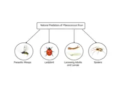 Planococcus ficus infestations are often controlled through biological enemies of the vine mealybug. Surrounding foliage and cover crops are planted to increase natural populations of vine mealybugs natural enemies.[8]