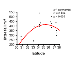 Latitude also has a strong effect on litterfall rates and thickness. Specifically, litterfall declines with increasing latitude. In tropical rainforests, there is a thin litter layer due to the rapid decomposition,[7] while in boreal forests, the rate of decomposition is slower and leads to the accumulation of a thick litter layer, also known as a mor.[3] Net primary production works inversely to this trend, suggesting that the accumulation of organic matter is mainly a result of decomposition rate.