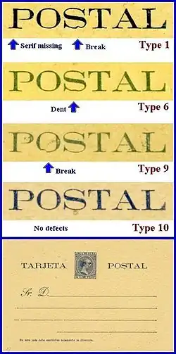 Plating refers to the reconstruction of a pane or "sheet" of postage stamps printed from a single plate by using individual stamps and overlapping strips and blocks of stamps.[1] Likewise, if a sheet 10 or 20 postal cards is typeset, the variations of the letters or design elements may allow reconstruction or plating of the sheets based on these differences.[2]