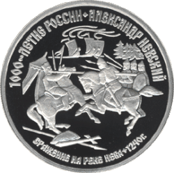 Reverse: a fight between four Russian soldiers and a Swedish knight, around: "1000 YEARS OF RUSSIA · Alexander Nevsky", "BATTLE AT THE RIVER NEVA 1240" Design: A.V. Baklanov Mint: Saint Petersburg Mint (LMD). 240 indents on the rim.[18] |