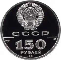 | 1991 | 150 rubles | Proof | 999/1000 | 15.57 | 28.6 | 16,000 | ||