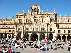 The Plaza Mayor (English Main Plaza) is a large plaza located in the center of Salamanca, Spain used as a public square.[1] It was built in the traditional Spanish baroque style and is a popular gathering area.[2] It is lined by restaurants, ice cream parlors, tourist shops, jewelry stores and a pharmacy along its perimeter except in front of the city hall. It is considered the heart of Salamanca and is widely regarded as one of the most beautiful plazas in Spain.[2][3][4] It is connected to the shopping area Calle del Toro from the northeast, Calle de Zamora from the north, the restaurants on Calle de Concejo from the northwest, Calle del Prior and the small Calle de la Caja de Ahorros from the west as well as Plaza del Corrillo from the south.