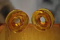 A plug (sometimes earplug or earspool), in the context of body modification, is a short, cylindrical piece of jewelry commonly worn in larger-gauge body piercings.[1] Modern western plugs are also called flesh tunnels. Because of their size—which is often substantially thicker than a standard metal earring—plugs can be made out of almost any material. Acrylic glass, metal, wood, bone, stone, horn, glass, silicone or porcelain are all potential plug materials.