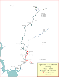 - ^ Authorities are imprecise about the extent of the first opening. The most thorough works are probably Kendall, and also Shepherd, who on page 51 simply refers to "Opening Day" without indicating the extent. On the same page he says that "the extensions at each end of the line—to Sutton Pool in the south and to Princetown in the north—were completed in December 1825 and December 1826 respectively". However his map of the line on page 9 shows "original terminus of the line" at Crabtree. Dart, in "Devon Narrow Gauge" says on the page following plate 21, that "In 1825 the line was extended to Sutton Harbour, with a branch to Laira (Martin's) Wharf. The section from the quarries to Princetown opened in 1826." (Laira is on the Cattewater, a location also referred to.)