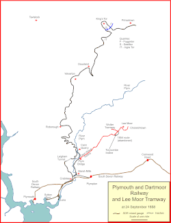 This was the de facto position, and the P&DR proprietors were unable to have the clause containing the words removed. The section from Plympton to the junction near Marsh Mills was sold to the SDR and closed in 1847 to allow them to construct their main line without the necessity of making a crossing of the P&DR.[8] Lord Morley seems to have acquiesced in this; his china clay traffic from Lee Moor used Plympton as a railhead and he may have considered the SDR a more efficient carrier from there to Plymouth.