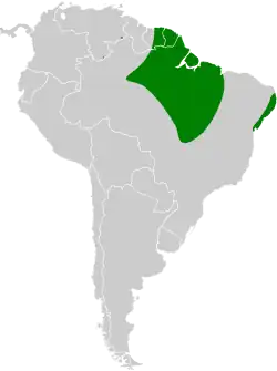 The smoky-fronted tody-flycatcher has a disjunct distribution. Subspecies P. f. penardi is the more northerly of the two. It is found primarily in Suriname and French Guiana.[2][8] There is a record from southern Amazonas state and what is believed to be this subspecies has been recorded in southeastern Bolívar state, both in Venezuela.[10][11] The nominate subspecies is found in two areas of Brazil. One is from central Pará east to southern Maranhão and south to northeastern Mato Grosso. The other is along the eastern coast from Paraíba south to northern Bahia.[8][9]