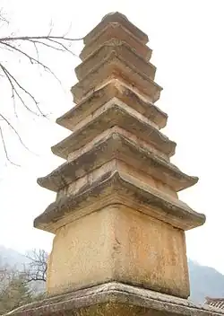 Pohyon-sa is a Korean Buddhist temple located in Hyangsan county in North Pyong'an Province, North Korea. It is located within the Myohyang Mountains. Founded under the Koryo dynasty at the start of the 11th century, the temple flourished as one of the greatest centers of Buddhism in the north of Korea, and became a renowned place of pilgrimage. Like most other temples in North Korea, the complex suffered extensive damage from US bombing during the Korean War. The temple is designated as National Treasure #40 in North Korea, with many of its component buildings and structures further declared as individual national treasures.