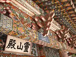 The main hall of the temple, Taeung Hall (大雄殿) was also destroyed during the Korean War by U.S. bombing; reconstructed in 1976, it stands as faithful replica of the 1765 original. In the courtyard between it and Manse Pavilion stands the 13-storey Sokka Pagoda (釋迦塔), erected in the 14th century and designated National Treasure #144.