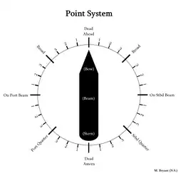 The point system is a common way of identifying the location of contacts relative to the heading of a ship. It is a form of relative bearing. The point system uses 32 evenly spaced imaginary points that circle the ship starting at the forward bow. Individual points sit at intervals of 11.25°, similar to compass bearings.[1] The lookout, when having sighted something beyond the ship, will call out the object's location by stating its position relative to the bow, stern, or beam of the ship, noting whether on the port or starboard side when applicable. [2]