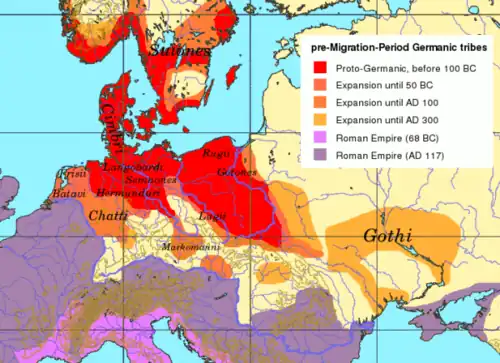 c.^ "Germanic" identification is used here as a broad approximation. The article deals with archeological cultures whose ethnic and linguistic identifications are often unknown or uncertain.