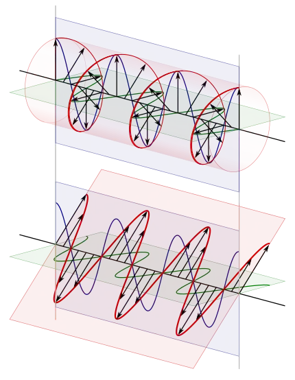 At the top of the illustration toward the right is the circularly polarized light after it leaves the wave plate. Directly below it, for comparison purposes, is the linearly polarized light that entered the quarter-wave plate. In the upper image, because this is a plane wave, each vector leading from the axis to the helix represents the magnitude and direction of the electric field for an entire plane that is perpendicular to the direction of travel. All the electric field vectors have the same magnitude indicating that the strength of the electric field does not change. The direction of the electric field however steadily rotates.