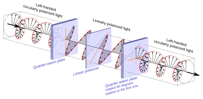 First note that a quarter-wave plate always transforms circularly polarized light into linearly polarized light. It is only the resulting angle of polarization of the linearly polarized light that is determined by the orientation of the fast and slow axes of the quarter-wave plate and the handedness of the circularly polarized light. In the illustration, the left-handed circularly polarized light entering the polarizer is transformed into linearly polarized light which has its direction of polarization along the transmission axis of the linear polarizer and it therefore passes. In contrast right-handed circularly polarized light would have been transformed into linearly polarized light that had its direction of polarization along the absorbing axis of the linear polarizer, which is at right angles to the transmission axis, and it would have therefore been blocked.