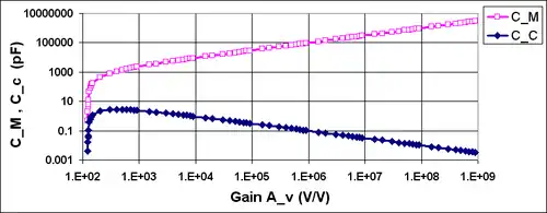 which provides a quadratic equation to determine an appropriate value for CC. Figure 4 shows an example using this equation. At low values of gain this example amplifier satisfies the pole-ratio condition without compensation (that is, in Figure 4 the compensation capacitor CC is small at low gain), but as gain increases, a compensation capacitance rapidly becomes necessary (that is, in Figure 4 the compensation capacitor CC increases rapidly with gain) because the necessary pole ratio increases with gain. For still larger gain, the necessary CC drops with increasing gain because the Miller amplification of CC, which increases with gain (see the Miller equation), allows a smaller value for CC.